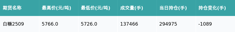 南财智讯7月8日电,南财金融终端盘后期货数据显示,郑州商品交易所的白糖主力合约收跌0.19%,收盘报5747.0元/吨,日内资金流出1166.33万元。其他相关指标见下表: