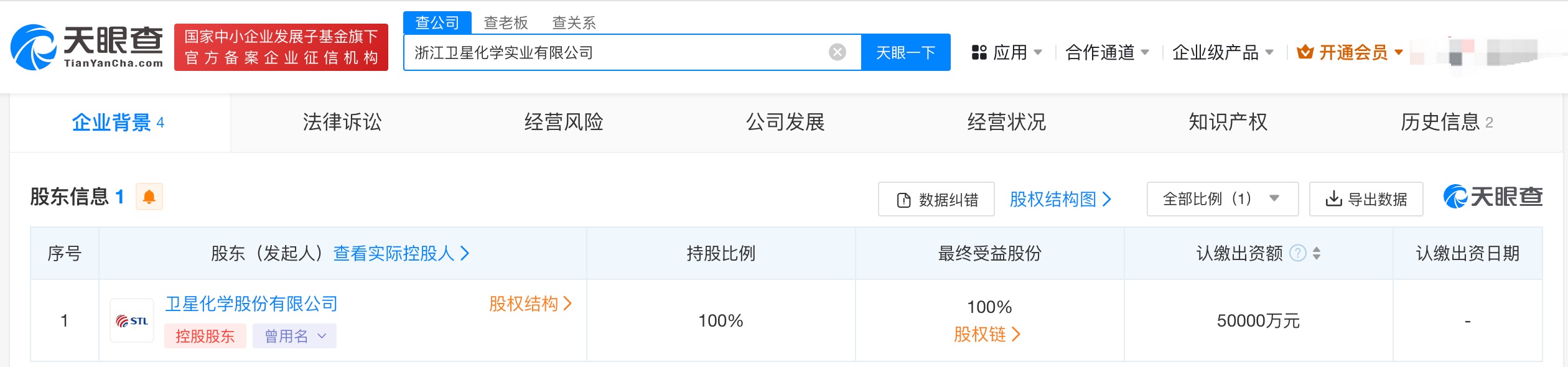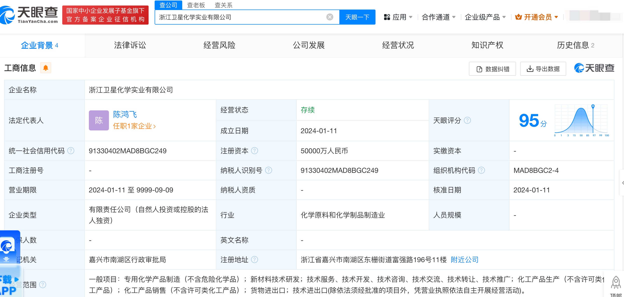 南方财经1月15日电,天眼查App显示,近日,浙江卫星化学实业有限公司成立,法定代表人为陈鸿飞,注册资本5亿人民币,经营范围含专用化学产品制造、新材料技术研发、化工产品生产、化工产品销售等。股东信息显示,该公司由卫星化学(002648)全资持股。