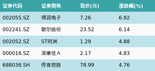 截至午间收盘,智能电视主题涨跌幅最高的五只股票为:得润电子(002055.SZ)、歌尔股份(002241.SZ)、ST同洲(002052.SZ)、深康佳A(000016.SZ)与传音控股(688036.SH)。详情见下表: