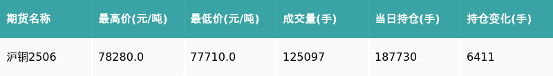 南财智讯5月12日电,南财金融终端盘后期货数据显示,上海期货交易所的沪铜主力合约收涨0.77%,收盘报78260.0元/吨,日内资金流入6.49亿元。其他相关指标见下表: