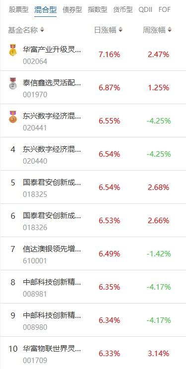 南方财经4月14日电,根据南财基金通数据:2025年04月11日当日收益靠前的混合型基金包括:华富产业升级灵活配置混合型证券投资基金(002064,日收益7.16%);泰信鑫选灵活配置混合型证券投资基金(001970,日收益6.87%);东兴数字经济混合型发起式证券投资基金(020441,日收益6.55%)等。收益较低的混合型基金包括:信澳产业优选一年持有期混合型证券投资基金(013496,日收益-2.32%);银河消费驱动混合型证券投资基金(519678,日收益-1.76%);中航混改精选混合型证券投资基金(004936,日收益-1.46%)等。