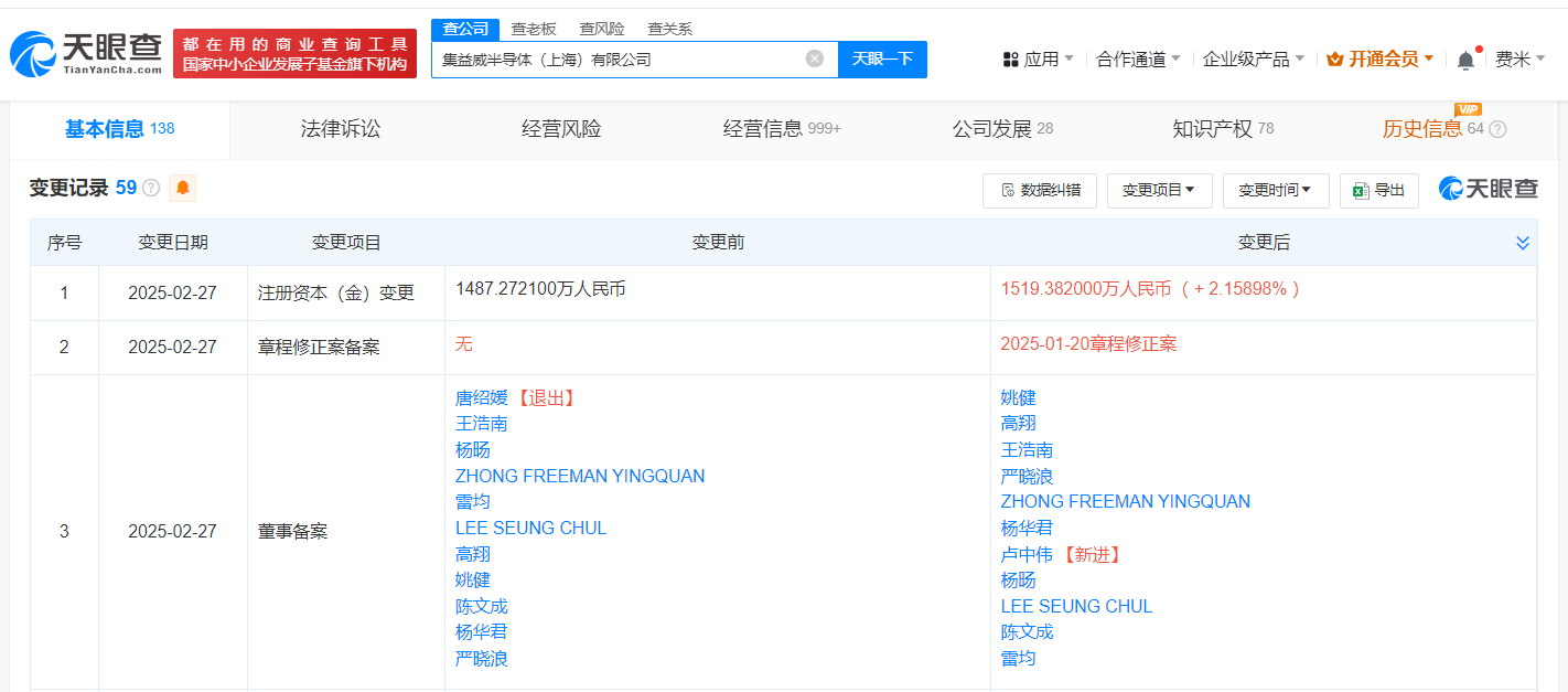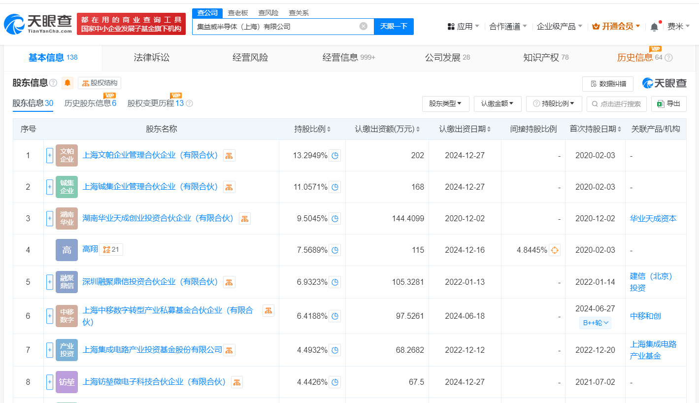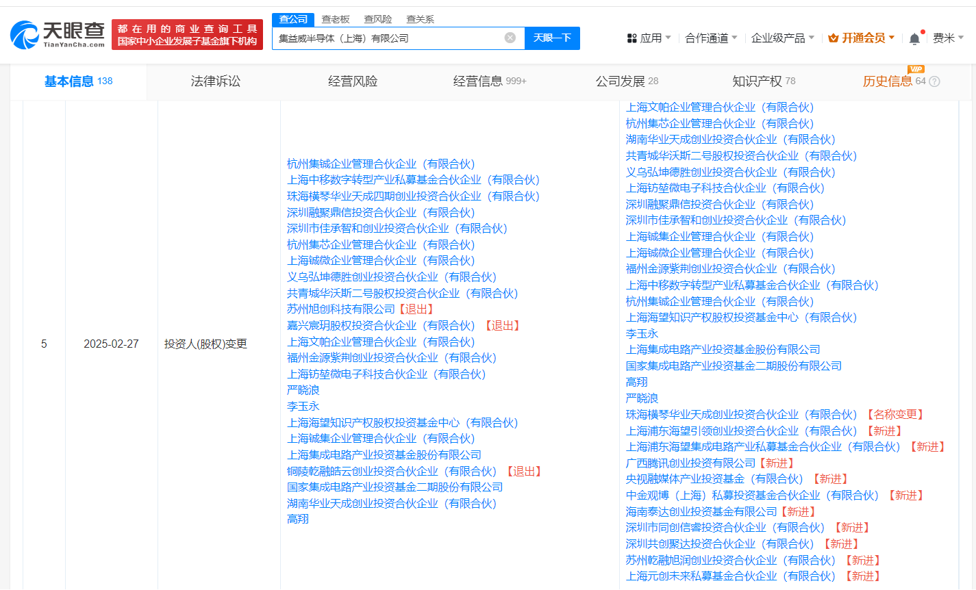 南方财经3月3日电,天眼查App显示,近日,集益威半导体(上海)有限公司发生工商变更,原股东苏州旭创科技有限公司、铜陵乾融皓云创业投资合伙企业(有限合伙)等退出,新增广西腾讯创业投资有限公司、央视融媒体产业投资基金(有限合伙)等为股东,注册资本由约1487.3万人民币增至约1519.4万人民币。该公司成立于2019年8月,法定代表人为王浩南,经营范围含集成电路芯片及产品销售、集成电路芯片设计及服务、电子产品销售等,现由上海文帕企业管理合伙企业(有限合伙)、国家集成电路产业投资基金二期股份有限公司及上述新增股东等共同持股。官网显示,该公司是一家高端IC(集成电路)设计公司。