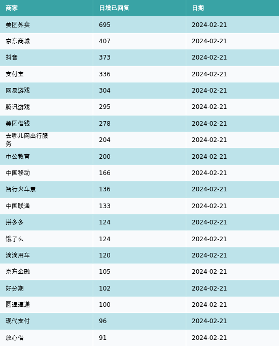 黑猫投诉:美团外卖、京东商城和抖音2月21日新增投诉回复695起、407起和373起