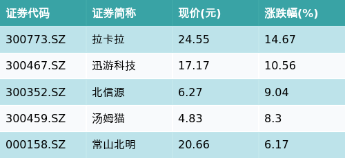 截至午间收盘,华为HMS主题涨跌幅最高的五只股票为:拉卡拉(300773.SZ)、迅游科技(300467.SZ)、北信源(300352.SZ)、汤姆猫(300459.SZ)与常山北明(000158.SZ)。详情见下表:
