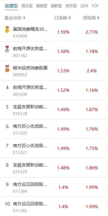 南方财经2月5日电,根据南财基金通数据:2025年01月27日当日收益靠前的股票型基金包括:富国消费精选30股票型证券投资基金(010409,日收益1.59%);前海开源优势蓝筹股票型证券投资基金(001162,日收益1.58%);银华品质消费股票型证券投资基金(009852,日收益1.53%)等。收益较低的股票型基金包括:新华策略精选股票型证券投资基金(001040,日收益-6.25%);宏利转型机遇股票型证券投资基金(000828,日收益-6%);财通集成电路产业股票型证券投资基金(006503,日收益-5.29%)等。
