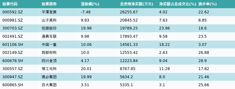南财智讯12月19日电,南财金融终端数据显示,因当日异动登上龙虎榜的个股中,资金净买入最多的前三位分别是平潭发展(000592.SZ)、山子高科(000981.SZ)与创源股份(300703.SZ)。其中排名第一的平潭发展净买额达2.63亿元,占总成交金额的4.02%。平潭发展当日收盘下跌7.48%,换手率为22.62%,净买入额前10个股详情见下图: