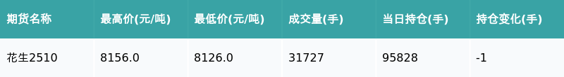 南财智讯7月24日电,南财金融终端盘后期货数据显示,郑州商品交易所的花生主力合约收跌0.15%,收盘报8130.0元/吨,日内资金流出92.65万元。其他相关指标见下表: