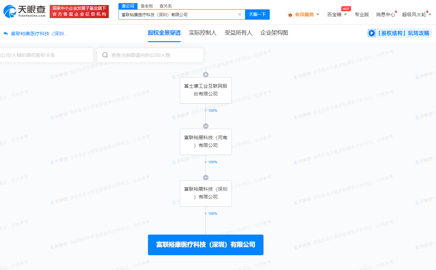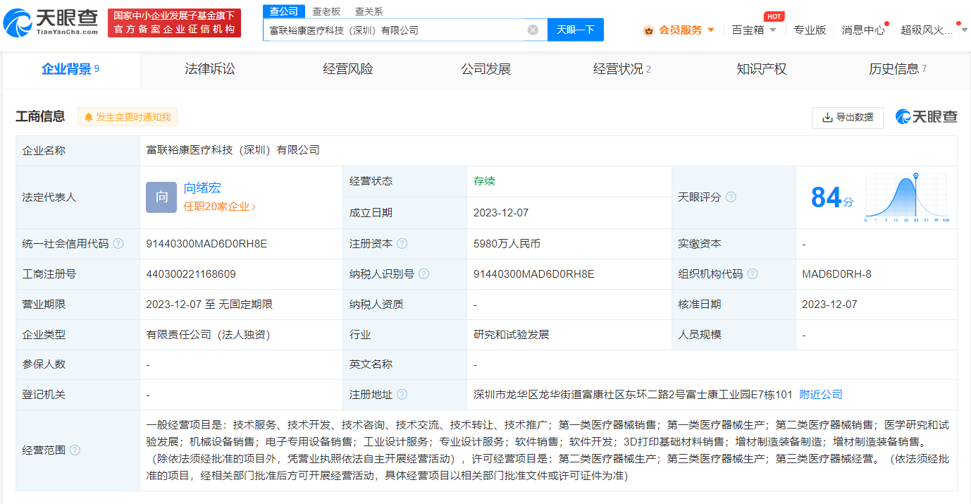 南方财经12月8日电,天眼查App显示,12月7日,富联裕康医疗科技(深圳)有限公司成立,法定代表人为向绪宏,注册资本5980万人民币,经营范围包括医学研究和试验发展、3D打印基础材料销售、第三类医疗器械经营等。股权全景穿透图显示,该公司为富联裕展科技(深圳)有限公司全资子公司,后者由工业富联(601138)间接全资持股。