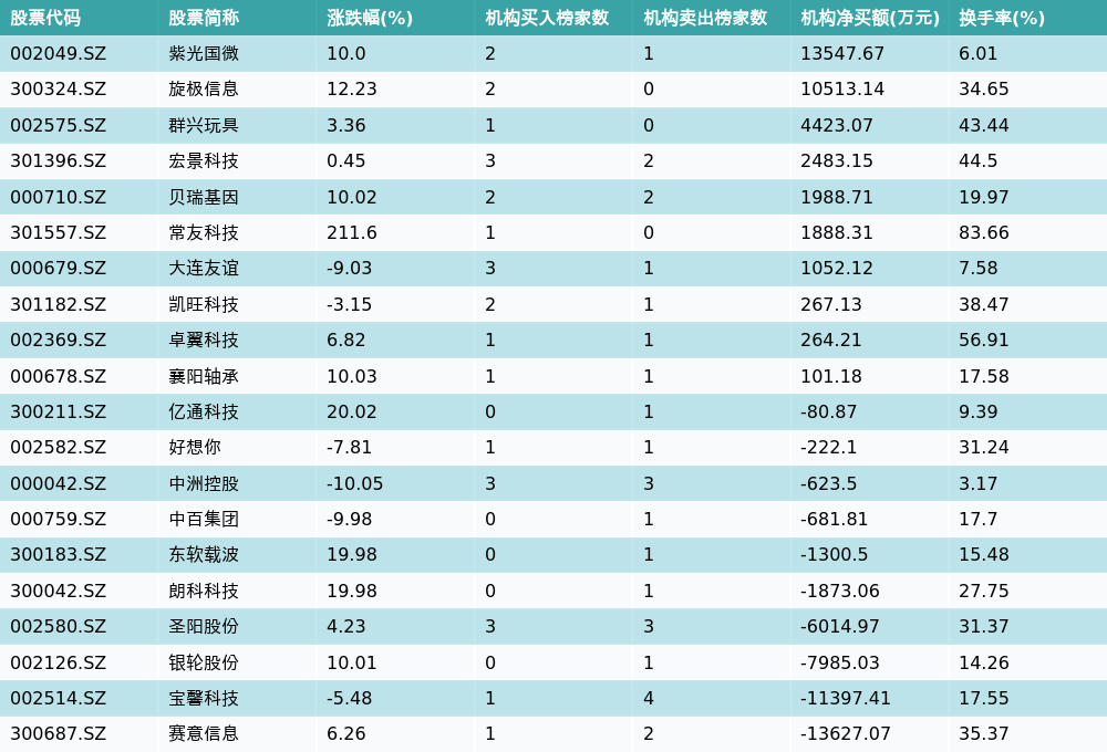 南方财经3月4日电,南财金融终端数据显示,因当日异动登上龙虎榜的个股中,20只沪深A股龙虎榜出现了机构的身影,机构合计净卖出7277.63万元,具体来看,机构净买入10只个股,净卖出10只个股。其中,机构净买入前三分别为紫光国微(002049.SZ)、旋极信息(300324.SZ)与群兴玩具(002575.SZ),详情见下图: