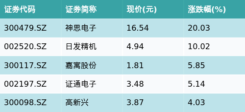 截至午间收盘,机器人概念主题涨跌幅最高的五只股票为:神思电子(300479.SZ)、日发精机(002520.SZ)、嘉寓股份(300117.SZ)、证通电子(002197.SZ)与高新兴(300098.SZ)。详情见下表: