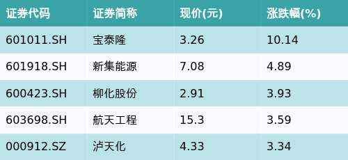 截至收盘,煤化工主题涨跌幅最高的五只股票为:宝泰隆(601011.SH)、新集能源(601918.SH)、柳化股份(600423.SH)、航天工程(603698.SH)与泸天化(000912.SZ)。详情见下表: