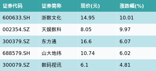 截至午间收盘,数据确权主题涨跌幅最高的五只股票为:浙数文化(600633.SH)、天娱数科(002354.SZ)、东方通(300379.SZ)、山大地纬(688579.SH)与数码视讯(300079.SZ)。详情见下表: