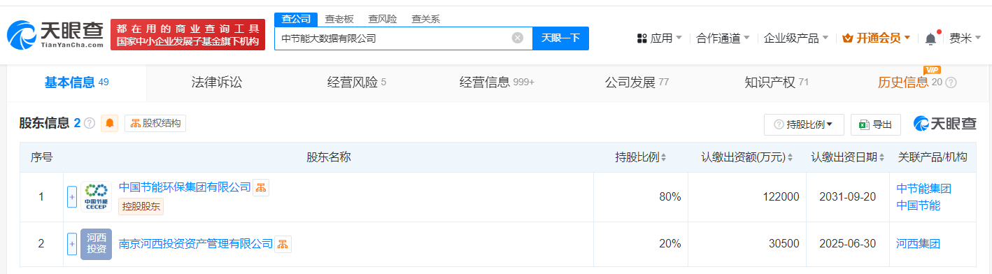 南方财经2月21日电,天眼查App显示,近日,中节能大数据有限公司发生工商变更,新增南京河西投资资产管理有限公司为股东,同时注册资本由12.2亿人民币增至15.25亿人民币,增幅25%。中节能大数据有限公司成立于2021年9月,法定代表人为郑朝晖,经营范围含云计算中心、计算机系统服务、基础软件服务、应用软件服务、大气污染治理、固体废物治理等,现由中国节能环保集团有限公司、南京河西投资资产管理有限公司分别持股80%、20%。