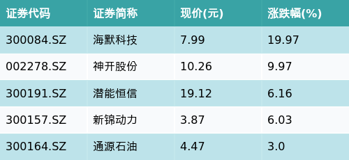 截至早盘收盘,可燃冰主题涨跌幅最高的五只股票为:海默科技(300084.SZ)、神开股份(002278.SZ)、潜能恒信(300191.SZ)、新锦动力(300157.SZ)与通源石油(300164.SZ)。详情见下表:
