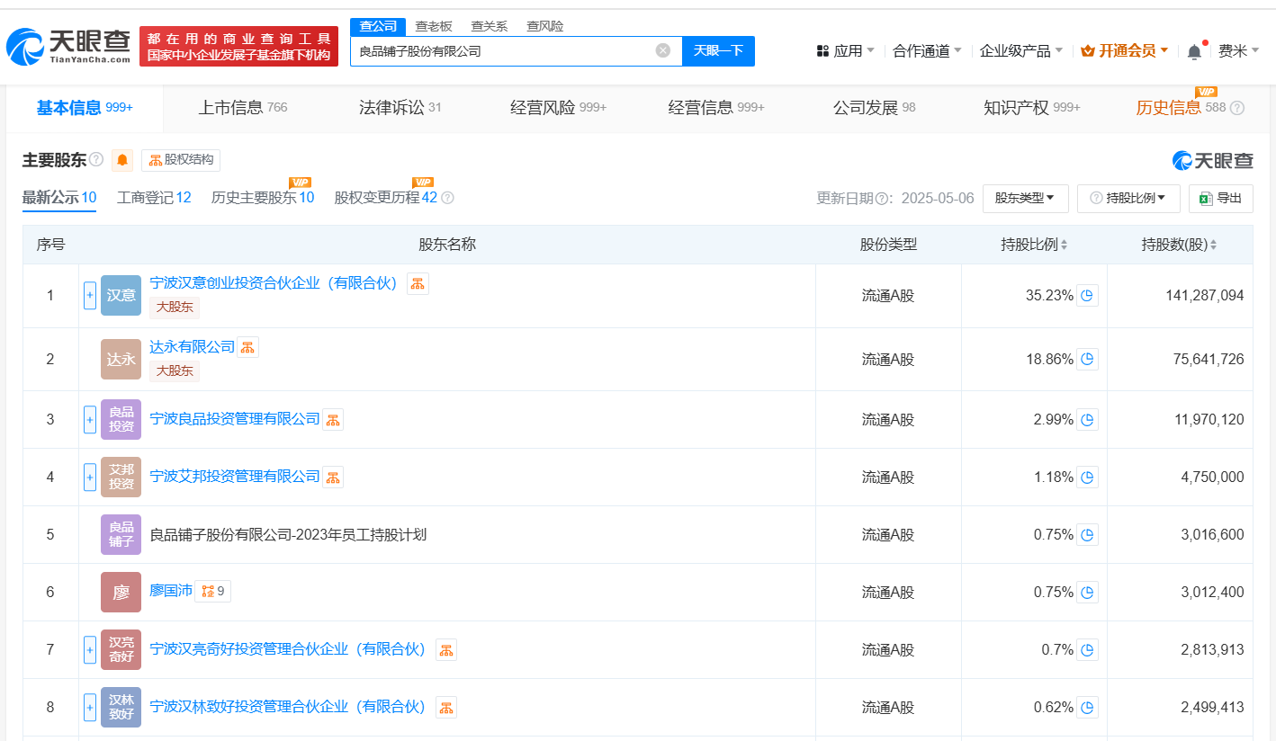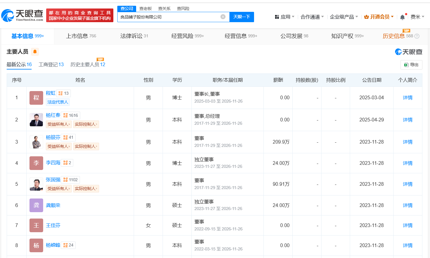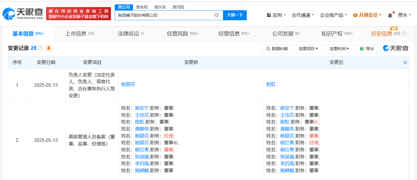 南方财经5月16日电,天眼查App显示,近日,良品铺子(603719)发生工商变更,杨银芬卸任法定代表人、董事长、经理,程虹接任法定代表人、董事长,杨红春接任经理,杨银芬仍担任该公司董事职务。良品铺子股份有限公司成立于2010年8月,注册资本4.01亿人民币,经营范围包括食品分装加工、仓储服务、场地出租等,由宁波汉意创业投资合伙企业(有限合伙)、达永有限公司、宁波良品投资管理有限公司等共同持股。据媒体此前报道,良品铺子披露公告称,杨银芬提出辞去公司董事长、总经理职务。辞职后,杨银芬仍将继续担任公司董事,程虹接任公司董事长,杨红春出任公司总经理。