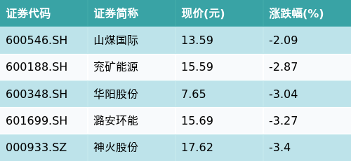 截至收盘,无烟煤主题涨跌幅最高的五只股票为:山煤国际(600546.SH)、兖矿能源(600188.SH)、华阳股份(600348.SH)、潞安环能(601699.SH)与神火股份(000933.SZ)。详情见下表: