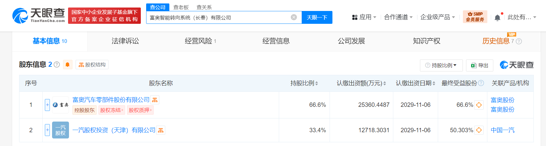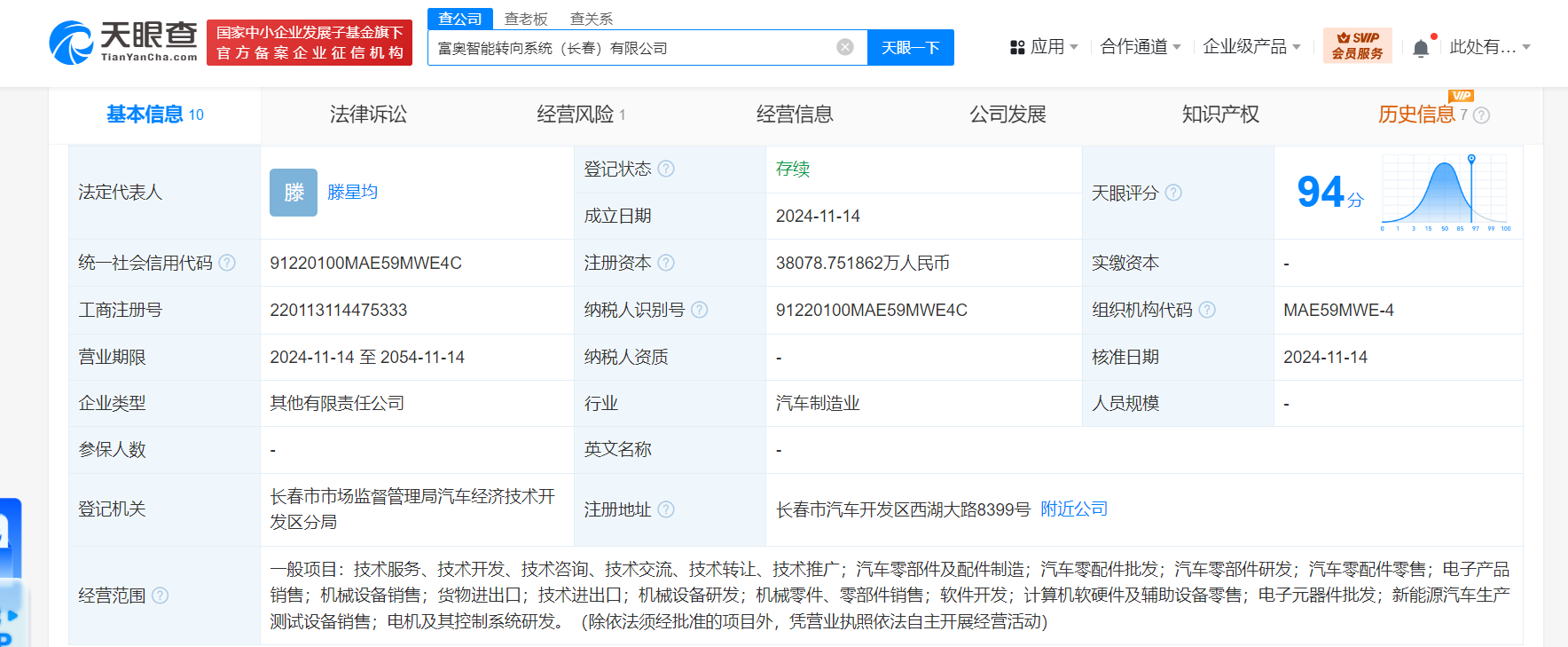 南方财经11月19日电,天眼查App显示,近日,富奥智能转向系统(长春)有限公司成立,法定代表人为滕星均,注册资本约3.8亿人民币,经营范围含汽车零部件及配件制造,汽车零配件批发,汽车零部件研发,货物进出口,技术进出口,机械设备研发,机械零件、零部件销售,计算机软硬件及辅助设备零售等。股东信息显示,该公司由富奥股份(000030)、一汽股权投资(天津)有限公司分别持股66.6%、33.4%。值得注意的是,近期,上述两股东还成立了富奥智能悬架系统(长春)有限公司,注册资本2亿人民币。