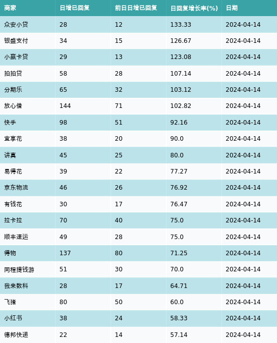 黑猫投诉:众安小贷、银盛支付和小赢卡贷4月14日投诉回复增速最高