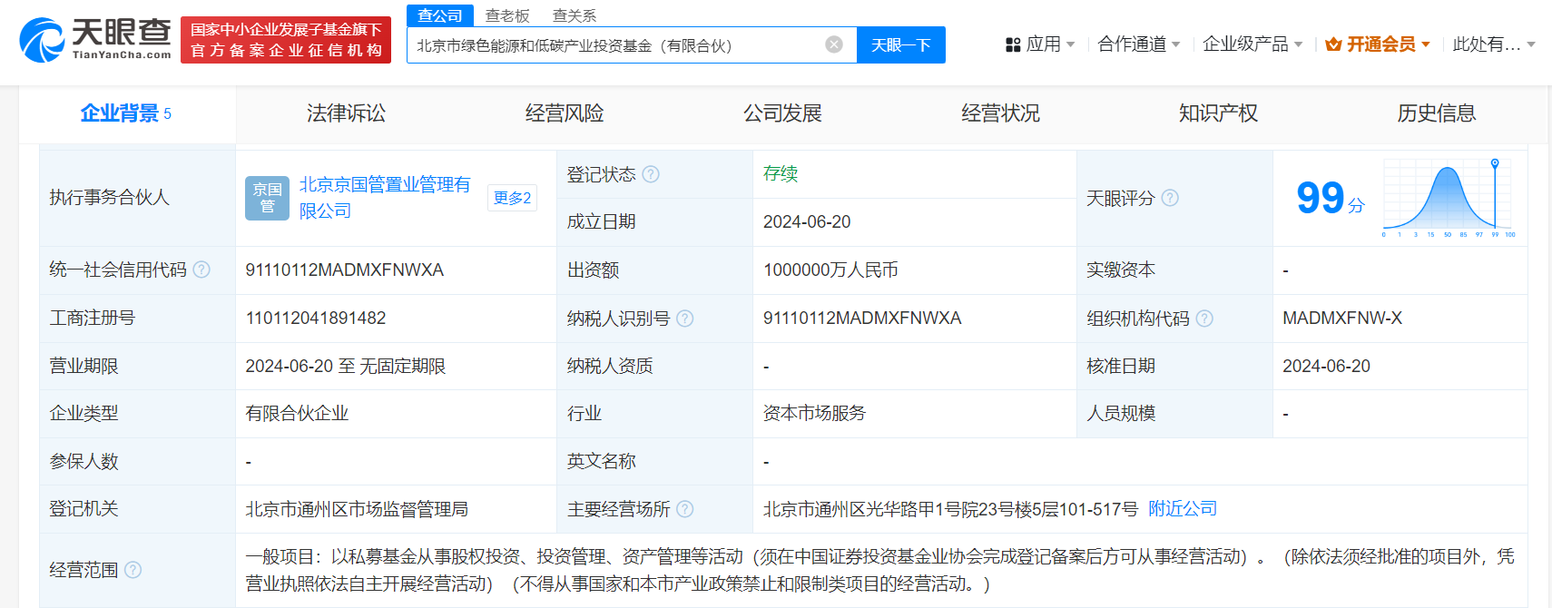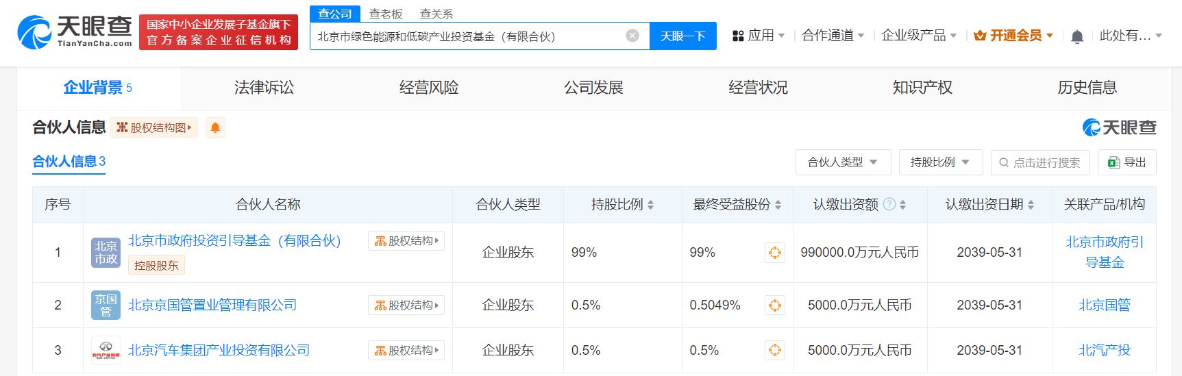 南方财经6月26日电,天眼查App显示,近日,北京市绿色能源和低碳产业投资基金(有限合伙)成立,执行事务合伙人为北京京国管置业管理有限公司、北京汽车集团产业投资有限公司,出资额100亿人民币,经营范围为以私募基金从事股权投资、投资管理、资产管理等活动。合伙人信息显示,该基金由北京市政府投资引导基金(有限合伙)、北京京国管置业管理有限公司、北京汽车集团产业投资有限公司共同出资。