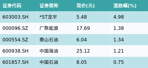 截至早盘收盘,石油主题涨跌幅最高的五只股票为:*ST龙宇(603003.SH)、广聚能源(000096.SZ)、泰山石油(000554.SZ)、中国海油(600938.SH)与中国石油(601857.SH)。详情见下表: