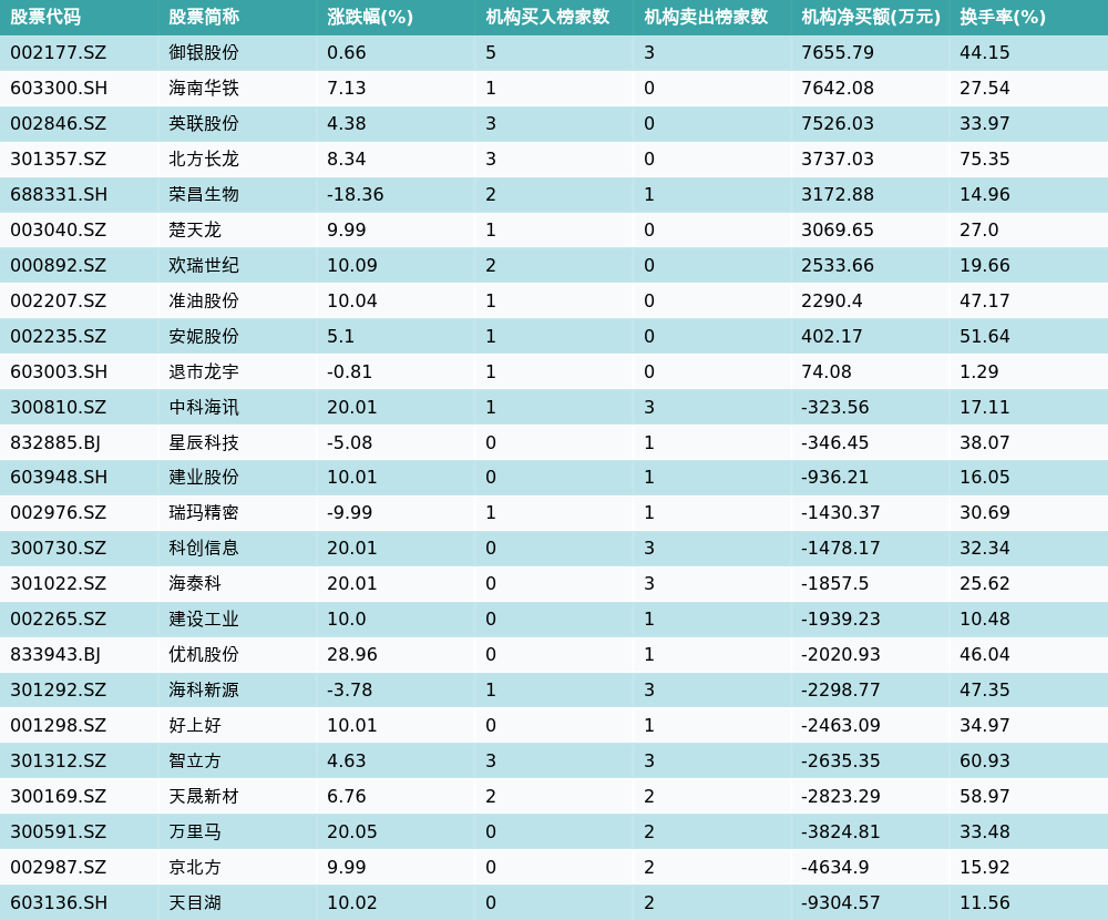 南财智讯6月26日电,南财金融终端数据显示,因当日异动登上龙虎榜的个股中,25只沪深A股龙虎榜出现了机构的身影,机构合计净卖出213.43万元,具体来看,机构净买入10只个股,净卖出15只个股。其中,机构净买入前三分别为御银股份(002177.SZ)、海南华铁(603300.SH)与英联股份(002846.SZ),详情见下图:机构净卖出的个股中,前三分别为天目湖(603136.SH)、京北方(002987.SZ)与万里马(300591.SZ)。