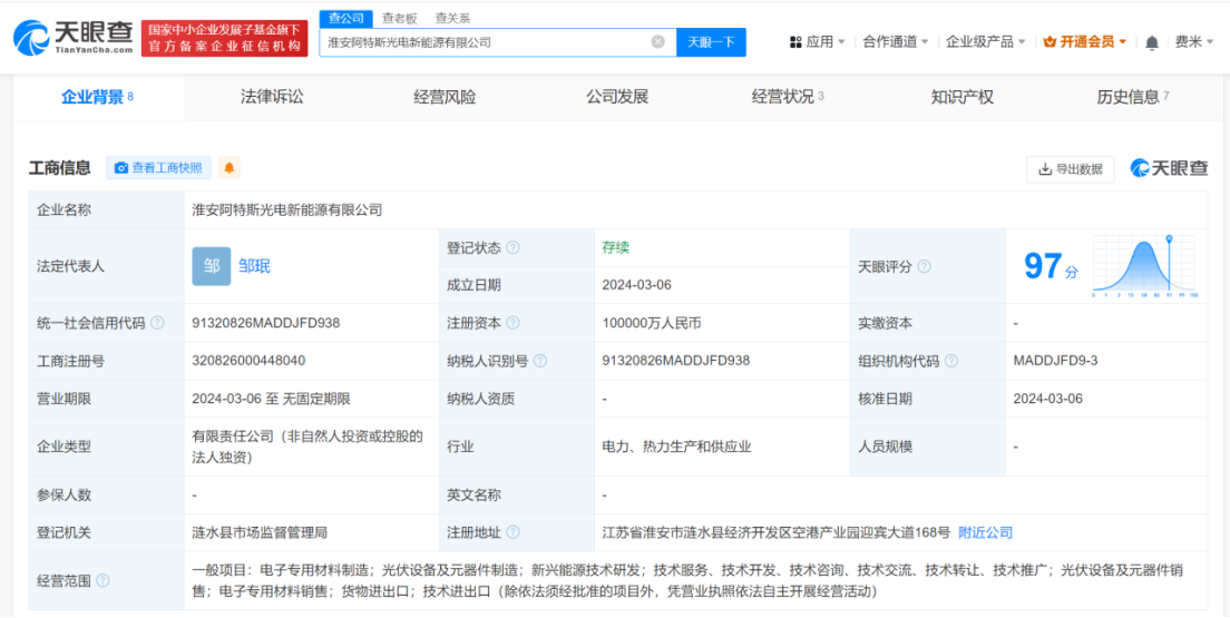 南方财经3月22日电,天眼查App显示,近日,淮安阿特斯光电新能源有限公司成立,法定代表人为邹珉,注册资本10亿人民币,经营范围含电子专用材料制造、光伏设备及元器件制造、新兴能源技术研发、光伏设备及元器件销售、电子专用材料销售等。股东信息显示,该公司由阿特斯(688472)全资持股。