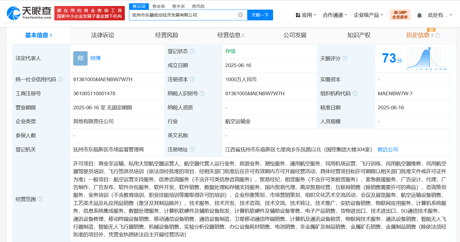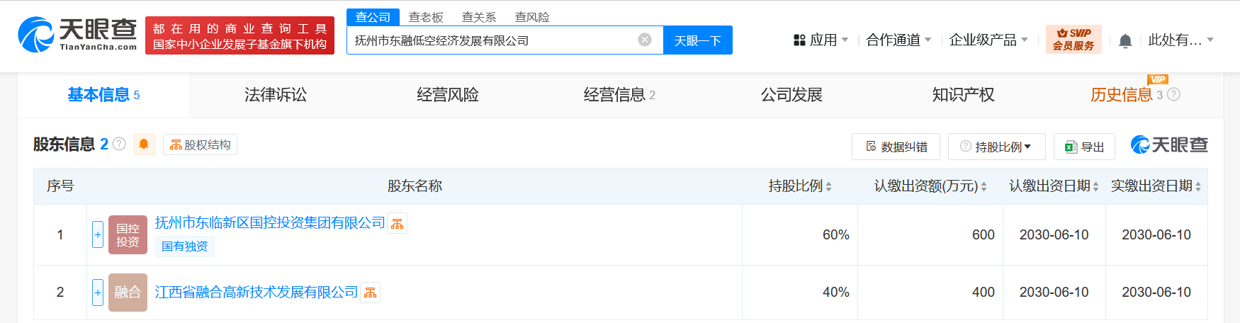 南方财经6月17日电,天眼查App显示,近日,抚州市东融低空经济发展有限公司成立,法定代表人为帅博,注册资本1000万人民币,经营范围含商业非运输、私用大型航空器运营人、航空器代管人运行业务、旅游业务、测绘服务、通用航空服务、民用机场运营、飞行训练、民用航空器维修等。股东信息显示,该公司由抚州市东临新区国控投资集团有限公司、江西省融合高新技术发展有限公司分别持股60%、40%。
