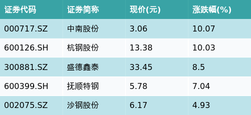 截至午间收盘,特钢概念主题涨跌幅最高的五只股票为:中南股份(000717.SZ)、杭钢股份(600126.SH)、盛德鑫泰(300881.SZ)、抚顺特钢(600399.SH)与沙钢股份(002075.SZ)。详情见下表: