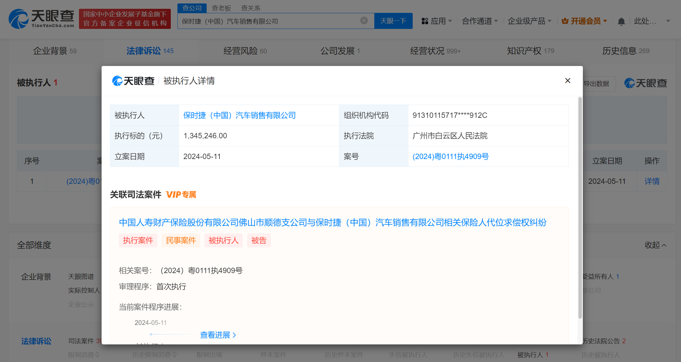 保时捷(中国)汽车销售有限公司被强制执行134万