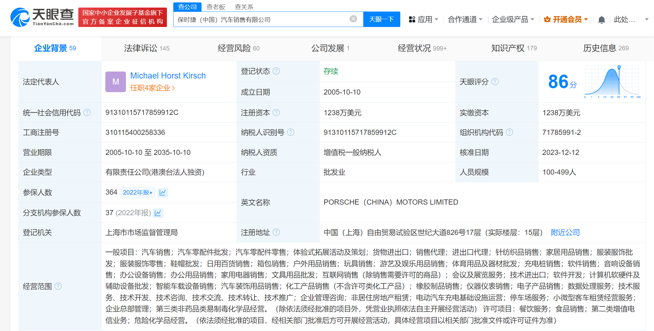 南方财经5月13日电,天眼查法律诉讼信息显示,近日,保时捷(中国)汽车销售有限公司新增一则被执行人信息,执行标的134万余元,涉及保险人代位求偿权纠纷案件,执行法院为广州市白云区人民法院。保时捷(中国)汽车销售有限公司成立于2005年10月,法定代表人为MICHAEL HORST KIRSCH,注册资本1238万美元。