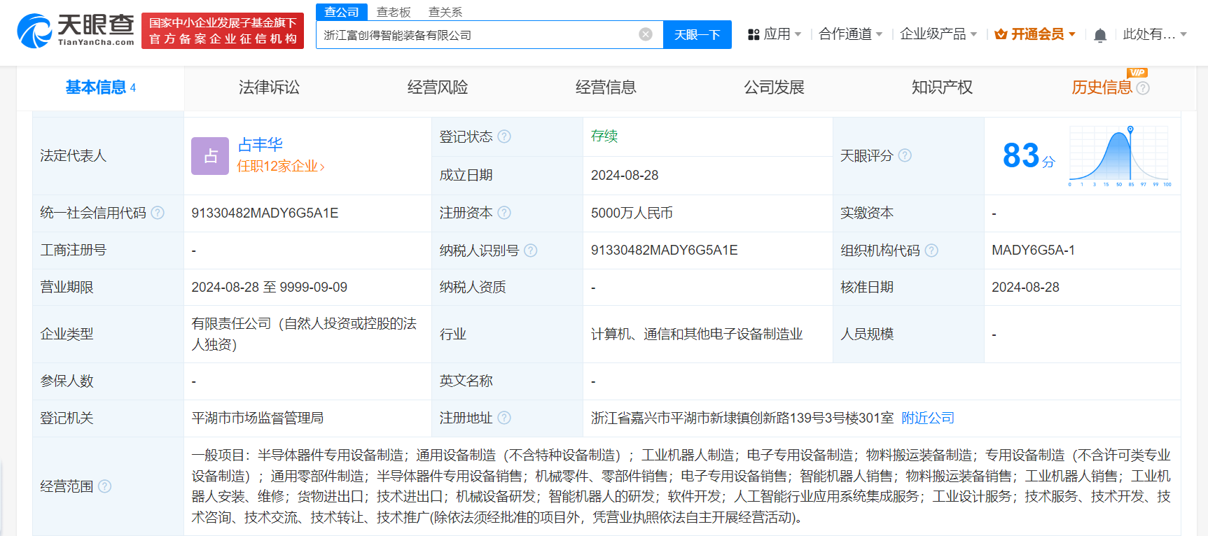 大族富创得在浙江成立智能装备公司 注册资本5000万
