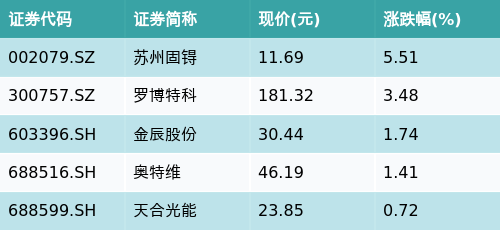 截至收盘,HJT电池主题涨跌幅最高的五只股票为:苏州固锝(002079.SZ)、罗博特科(300757.SZ)、金辰股份(603396.SH)、奥特维(688516.SH)与天合光能(688599.SH)。详情见下表: