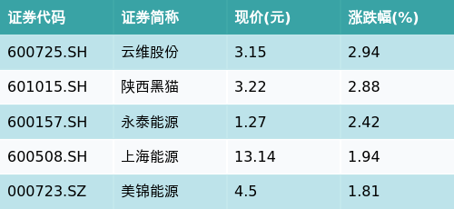 截至收盘,焦煤焦炭主题涨跌幅最高的五只股票为:云维股份(600725.SH)、陕西黑猫(601015.SH)、永泰能源(600157.SH)、上海能源(600508.SH)与美锦能源(000723.SZ)。详情见下表: