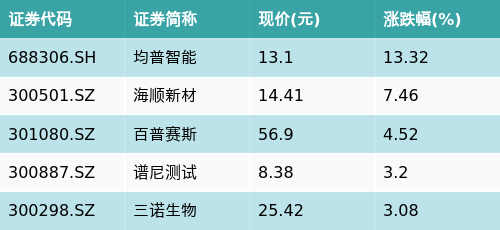 截至收盘,新冠检测主题涨跌幅最高的五只股票为:均普智能(688306.SH)、海顺新材(300501.SZ)、百普赛斯(301080.SZ)、谱尼测试(300887.SZ)与三诺生物(300298.SZ)。详情见下表: