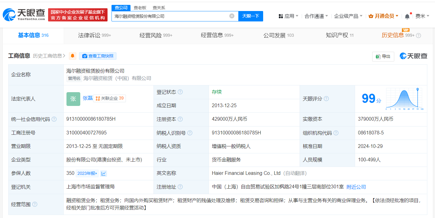 南方财经11月5日电,天眼查App显示,近日,海尔融资租赁股份有限公司发生工商变更,注册资本由37.9亿人民币增至42.9亿人民币,增幅约13%。海尔融资租赁股份有限公司成立于2013年12月,法定代表人为张磊,经营范围含融资租赁业务、租赁业务、向国内外购买租赁财产等,由海尔集团(青岛)金盈控股有限公司、上海海铸云聚企业管理咨询合伙企业(有限合伙)等共同持股。
