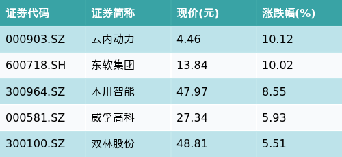 截至收盘,汽车电子概念主题涨跌幅最高的五只股票为:云内动力(000903.SZ)、东软集团(600718.SH)、本川智能(300964.SZ)、威孚高科(000581.SZ)与双林股份(300100.SZ)。详情见下表: