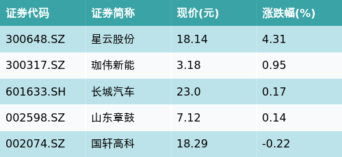 截至收盘,固态电池主题涨跌幅最高的五只股票为:星云股份(300648.SZ)、珈伟新能(300317.SZ)、长城汽车(601633.SH)、山东章鼓(002598.SZ)与国轩高科(002074.SZ)。详情见下表: