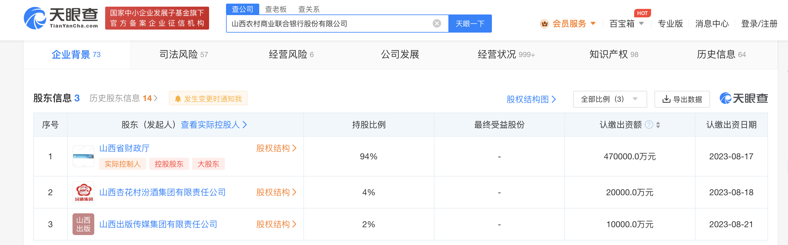 南方财经10月27日电,天眼查App显示,近日,山西省农村信用社联合社更名为山西农村商业联合银行股份有限公司,股东变更为山西省财政厅、山西杏花村汾酒集团有限责任公司、山西出版传媒集团有限责任公司,同时注册资本由2630万人民币增至50亿人民币。据媒体报道,10月23日,国家监管部门下达批复,山西农村商业联合银行将于近期挂牌开业。公开资料显示,山西省联社由省内108家农商行和农信社自愿入股组成。山西农村商业联合银行成立后,原山西省联社法人资格取消,原山西省联社的业务、资产,以及债权债务等权利义务均由山西农村商业联合银行承继。
