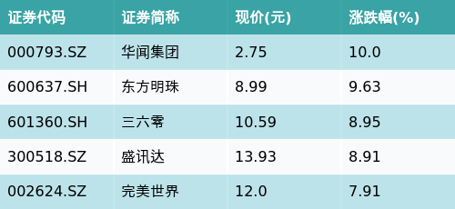 截至午间收盘,网络游戏主题涨跌幅最高的五只股票为:华闻集团(000793.SZ)、东方明珠(600637.SH)、三六零(601360.SH)、盛讯达(300518.SZ)与完美世界(002624.SZ)。详情见下表: