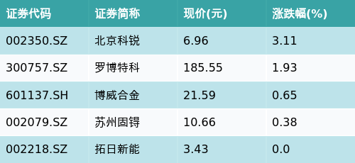 截至收盘,HJT电池主题涨跌幅最高的五只股票为:北京科锐(002350.SZ)、罗博特科(300757.SZ)、博威合金(601137.SH)、苏州固锝(002079.SZ)与拓日新能(002218.SZ)。详情见下表: