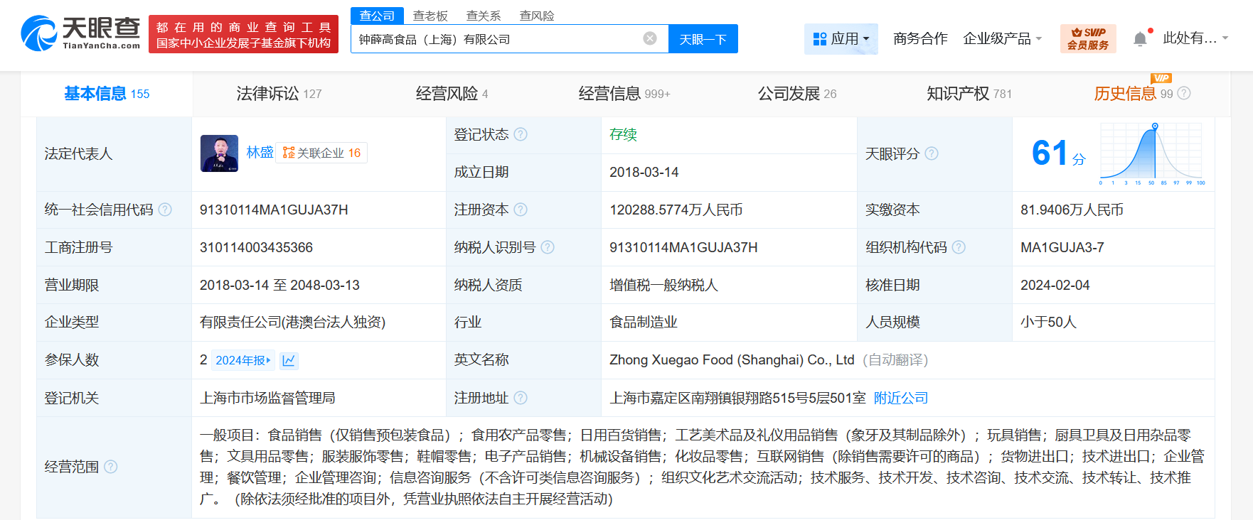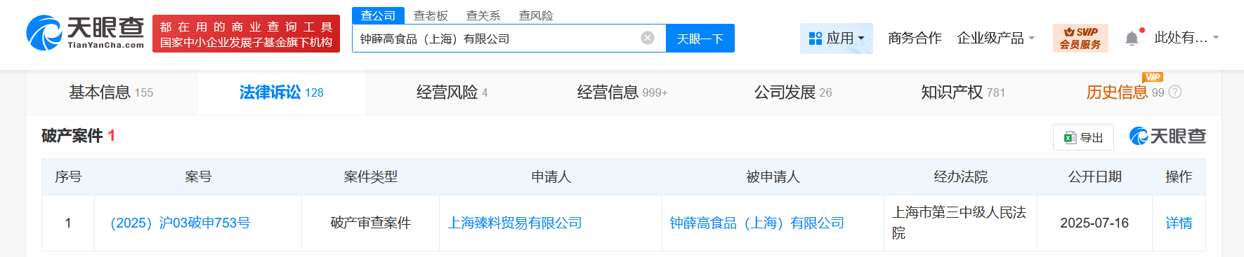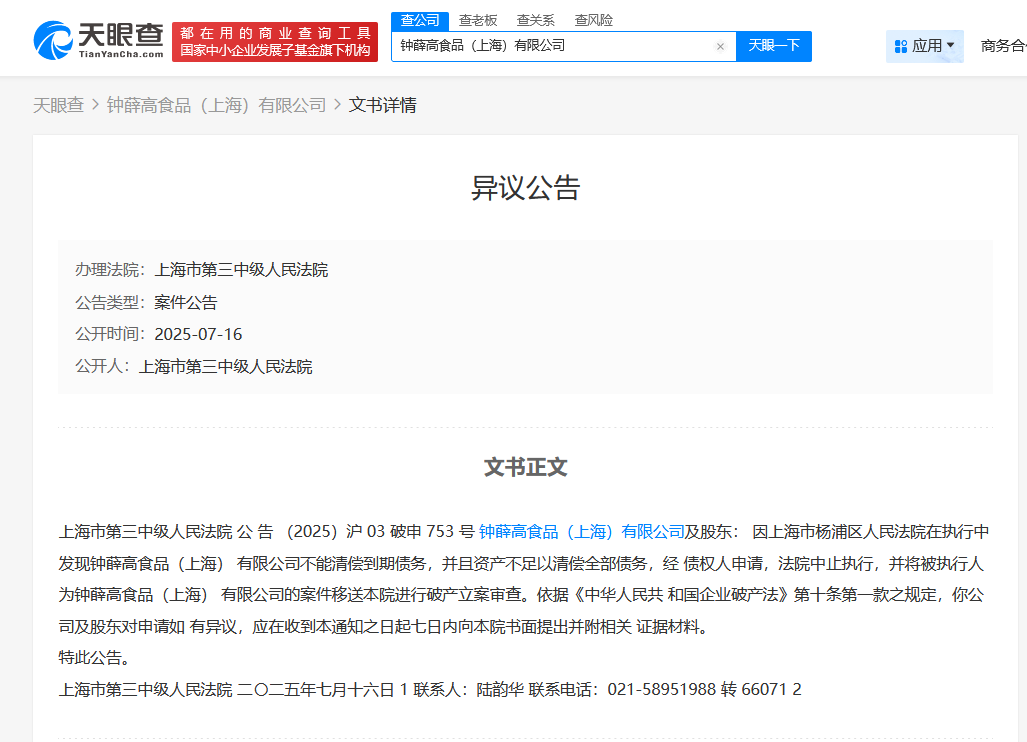 南方财经7月16日电,天眼查深度风险信息显示,7月16日,钟薛高食品(上海)有限公司新增一则破产审查信息,申请人为上海臻料贸易有限公司,经办法院为上海市第三中级人民法院。案件异议公告显示,因上海市杨浦区人民法院在执行中发现钟薛高食品(上海)有限公司不能清偿到期债务,并且资产不足以清偿全部债务,经债权人申请,法院中止执行,并将该案件移送本院进行破产立案审查。如有异议,应在收到本通知之日起七日内向法院书面提出并附相关证据材料。钟薛高食品(上海)有限公司成立于2018年3月,法定代表人为林盛,注册资本约12.03亿人民币,经营范围含食品销售、食用农产品零售、日用百货销售、工艺美术品及礼仪用品销售、互联网销售、餐饮管理、企业管理咨询等,由GloryseedHKLimited全资持股。风险信息显示,该公司现存多条被执行人、限制消费令、失信被执行人及终本案件信息。此前,钟薛高旗下钟茂(上海)食品科技有限公司、盘箸有喜(上海)生物科技有限公司均被申请破产审查。
