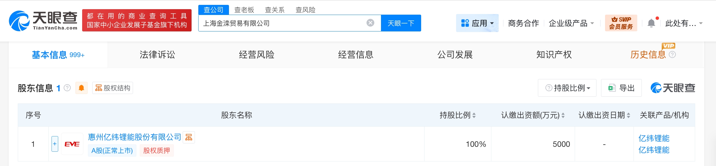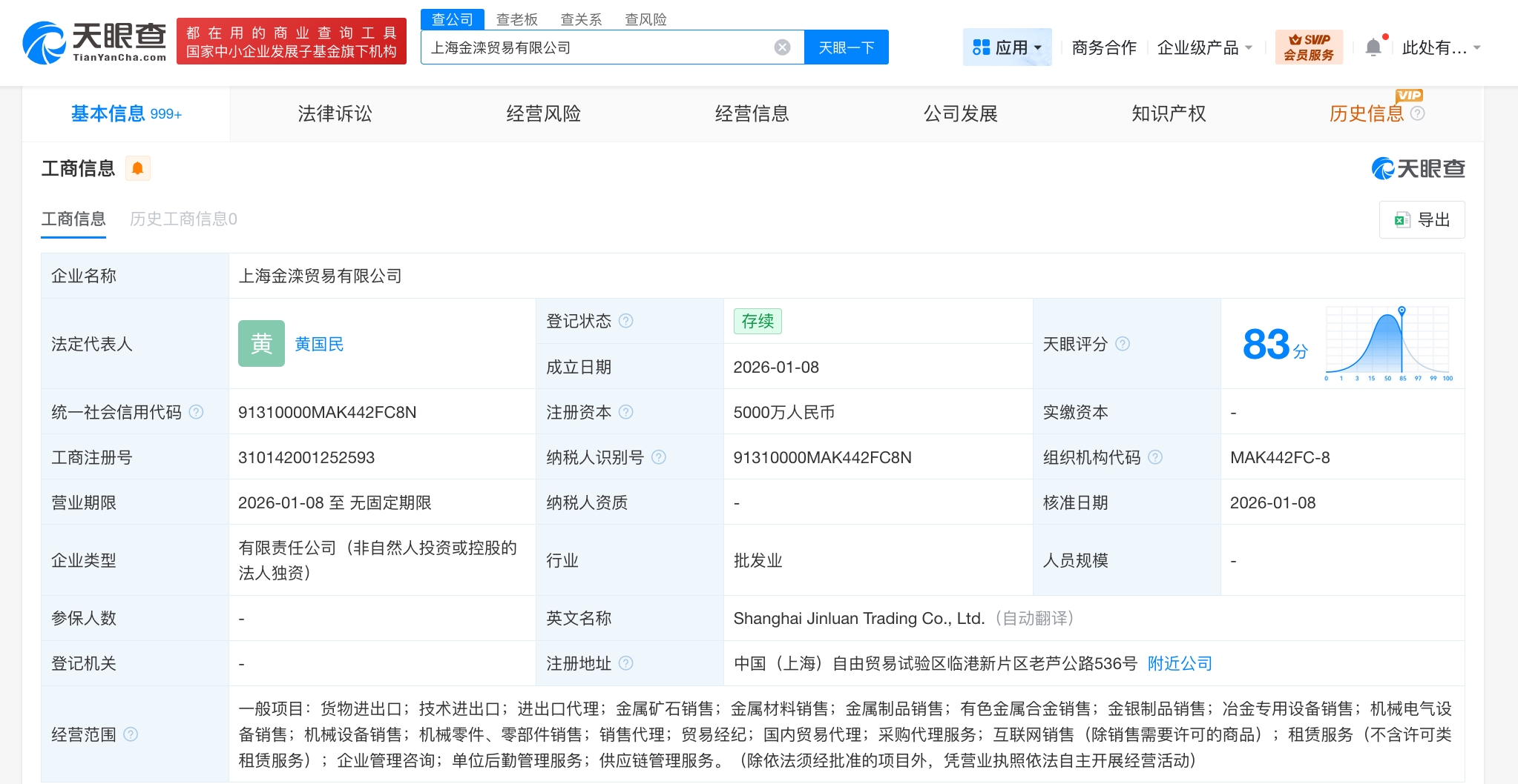 南方财经1月8日电,天眼查App显示,近日,上海金滦贸易有限公司成立,法定代表人为黄国民,注册资本5000万人民币,经营范围含货物进出口、技术进出口、进出口代理、金属矿石销售、金属制品销售、有色金属合金销售、机械设备销售、国内贸易代理、企业管理咨询等。股东信息显示,该公司由亿纬锂能(300014)全资持股。