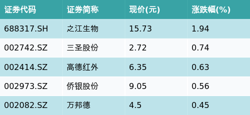 截至收盘,病毒防治主题涨跌幅最高的五只股票为:之江生物(688317.SH)、三圣股份(002742.SZ)、高德红外(002414.SZ)、侨银股份(002973.SZ)与万邦德(002082.SZ)。详情见下表:
