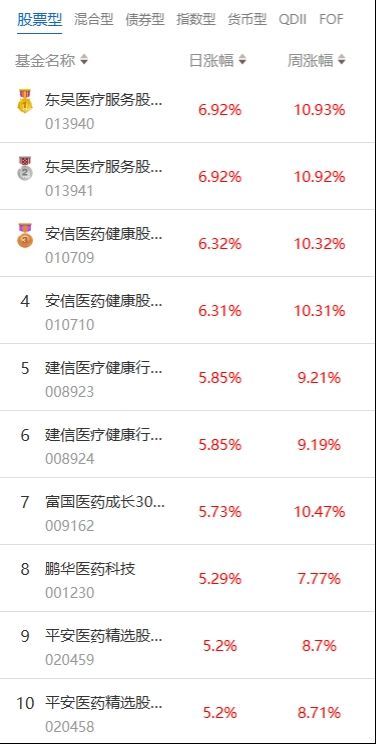 南方财经5月21日电,根据南财基金通数据,2025年05月20日当日收益靠前的股票型基金包括:东吴医疗服务股票型证券投资基金(013940,日收益6.92%);安信医药健康主题股票型发起式证券投资基金(010709,日收益6.32%);建信医疗健康行业股票型证券投资基金(008923,日收益5.85%)等。收益较低的股票型基金包括:中欧高端装备股票型发起式证券投资基金(016848,日收益-0.96%);金鹰先进制造股票型证券投资基金(LOF)(162107,日收益-0.47%);华宝高端装备股票型发起式证券投资基金(016114,日收益-0.44%)等。