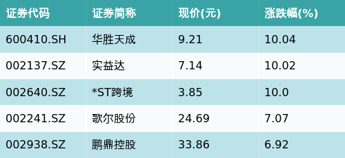截至午间收盘,无线耳机主题涨跌幅最高的五只股票为:华胜天成(600410.SH)、实益达(002137.SZ)、*ST跨境(002640.SZ)、歌尔股份(002241.SZ)与鹏鼎控股(002938.SZ)。详情见下表: