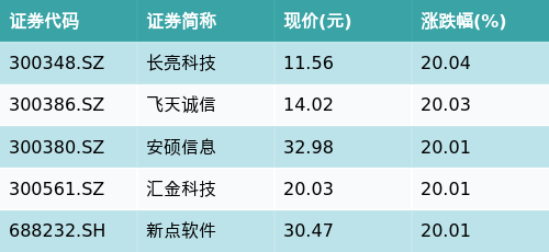 截至午间收盘,国产软件主题涨跌幅最高的五只股票为:长亮科技(300348.SZ)、飞天诚信(300386.SZ)、安硕信息(300380.SZ)、汇金科技(300561.SZ)与新点软件(688232.SH)。详情见下表: