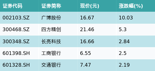 截至午间收盘,跨境支付(CIPS)主题涨跌幅最高的五只股票为:广博股份(002103.SZ)、四方精创(300468.SZ)、长亮科技(300348.SZ)、工商银行(601398.SH)与交通银行(601328.SH)。详情见下表: