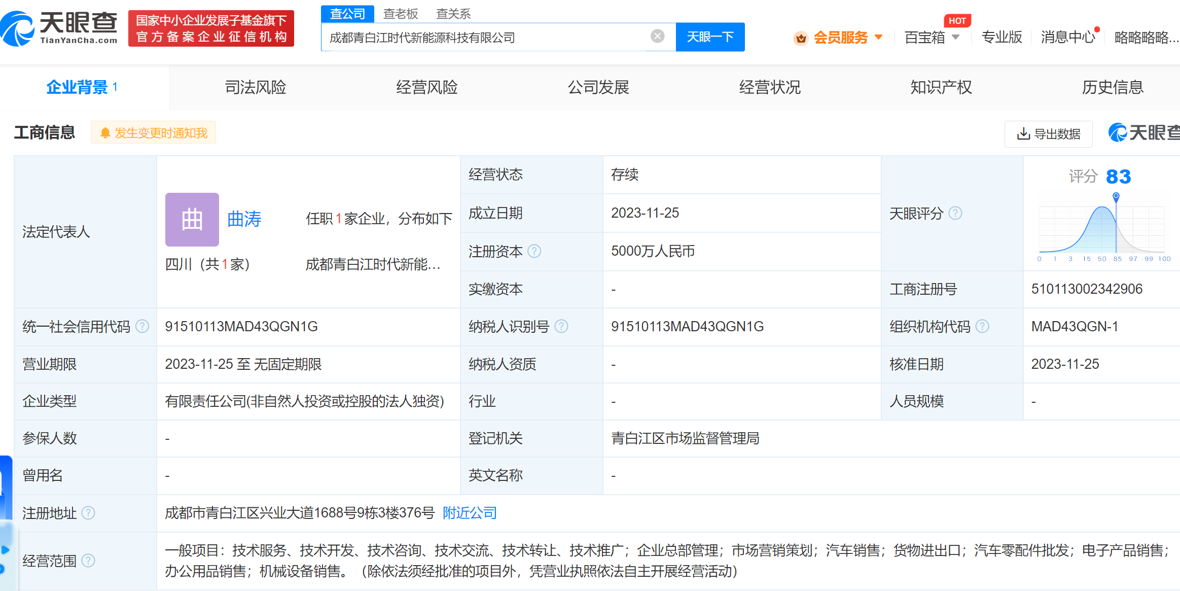 南方财经11月27日电,天眼查App显示,近日,成都青白江时代新能源科技有限公司成立,法定代表人为曲涛,注册资本5000万人民币,经营范围含企业总部管理、市场营销策划、汽车销售、汽车零配件批发、电子产品销售等。股东信息显示,该公司由宁德时代(300750)全资持股。据报道,今年8月,成都青白江区与宁德时代新能源科技股份有限公司、中国重汽集团成都王牌商用车有限公司等4家公司签约,五方将在新能源车辆研发与生产、新能源重卡(材料及产品)市场应用场景等方面深化合作。