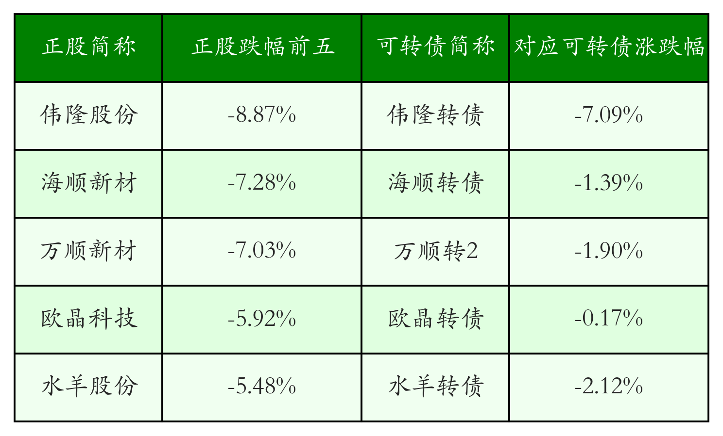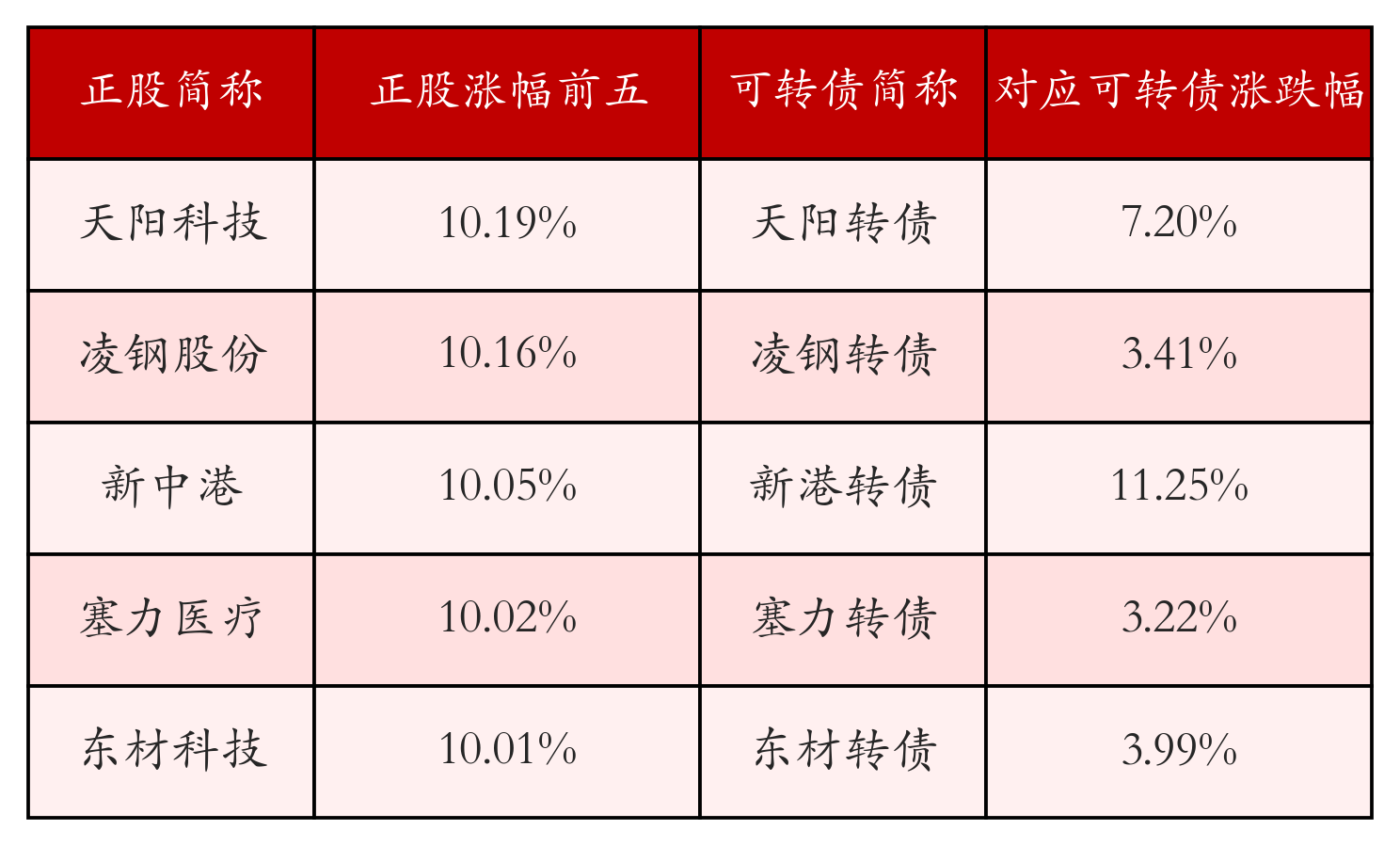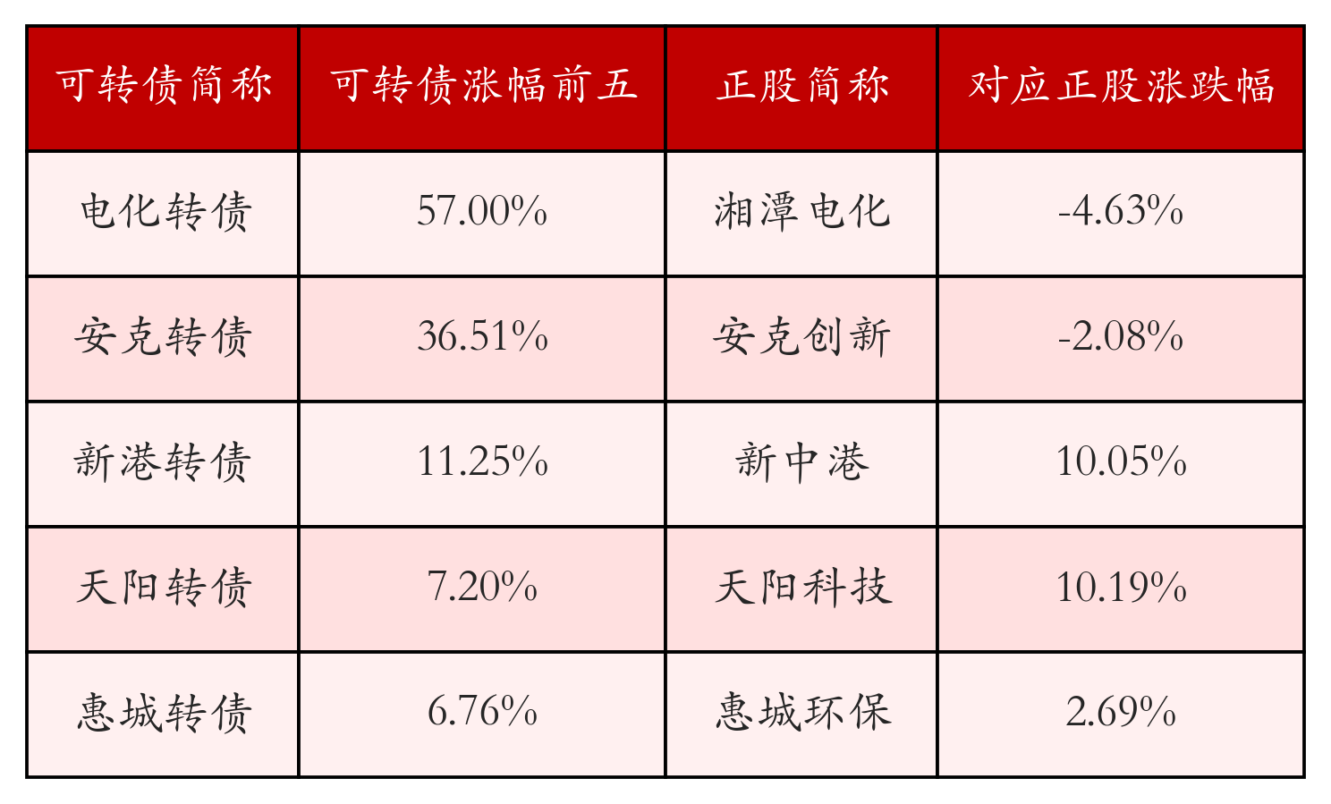 南财智讯7月4日电,南财金融终端盘后数据显示,债市方面,中证转债指数收涨0.15%,报447.46,成交额为750.5亿元。可转债方面,今日共成交469只可转债,其中169只收涨,0只收平,300只收跌。具体来看,18只可转债涨幅超过2%。其中电化转债(127109)涨57.0%,安克转债(123257)涨36.51%,新港转债(111013)涨11.25%。今日有22只可转债跌幅超2%,应急转债(123048)跌10.11%,精锻转债(123174)跌9.13%,伟隆转债(127106)跌7.09%。存在交易量的可转债所对应的正股中,109只收涨,9只收平,351只收跌。具体来看,13只可转债对应正股涨幅超过5%,其中,凌钢股份(600231)涨停,收涨10.16%;新中港(605162)涨停,收涨10.05%。同时所对应的可转债:凌钢转债(110070)同涨3.41%;新港转债(111013)同涨11.25%。今日有7只可转债对应正股跌幅超过5%,没有正股跌停。