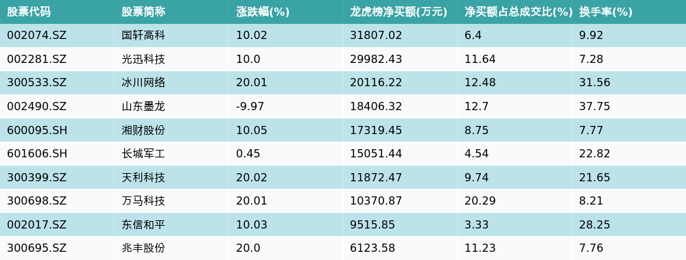 南财智讯6月24日电,南财金融终端数据显示,因当日异动登上龙虎榜的个股中,资金净买入最多的前三位分别是国轩高科(002074.SZ)、光迅科技(002281.SZ)与冰川网络(300533.SZ)。其中排名第一的国轩高科净买额达3.18亿元,占总成交金额的6.4%。国轩高科当日收盘上涨10.02%,换手率为9.92%,净买入额前10个股详情见下图: